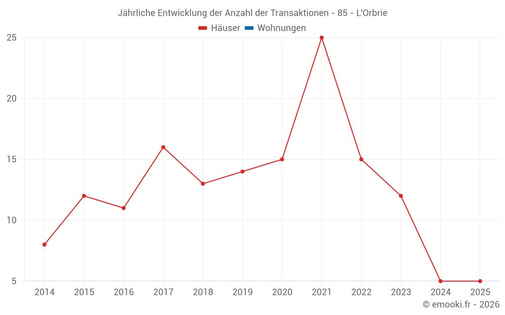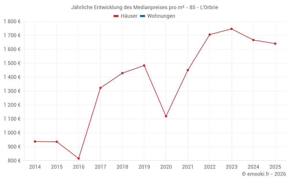 Der Durchschnittspreis auf den 15 Hausgeschäften der letzten 24 Monate in der Gemeinde L'Orbrie betrug 1 643 € pro Quadratmeter für einen mittleren Immobilienwert von 164 000 €. Über diesen Zeitraum hinweg lagen 60% der Transaktionen zwischen 1 083 und 2 203 € pro Quadratmeter (vom 2. bis zum 8. Dezil).