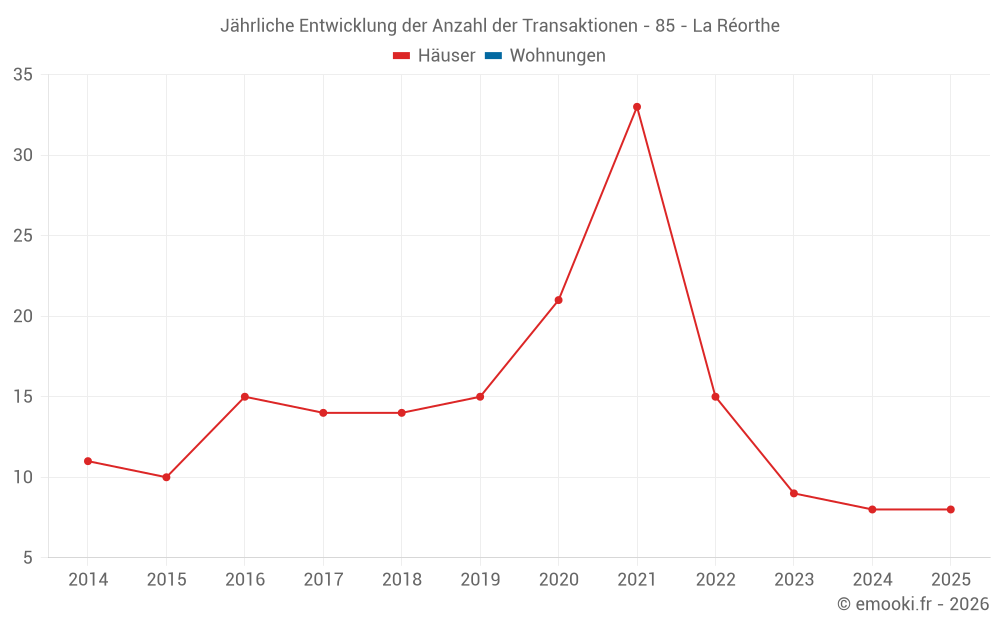 Der Durchschnittspreis auf den 19 Hausgeschäften der letzten 24 Monate in der Gemeinde La Réorthe betrug 1 060 € pro Quadratmeter für einen mittleren Immobilienwert von 110 000 €. Über diesen Zeitraum hinweg lagen 60% der Transaktionen zwischen 765 und 1 868 € pro Quadratmeter (vom 2. bis zum 8. Dezil).
