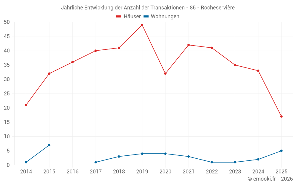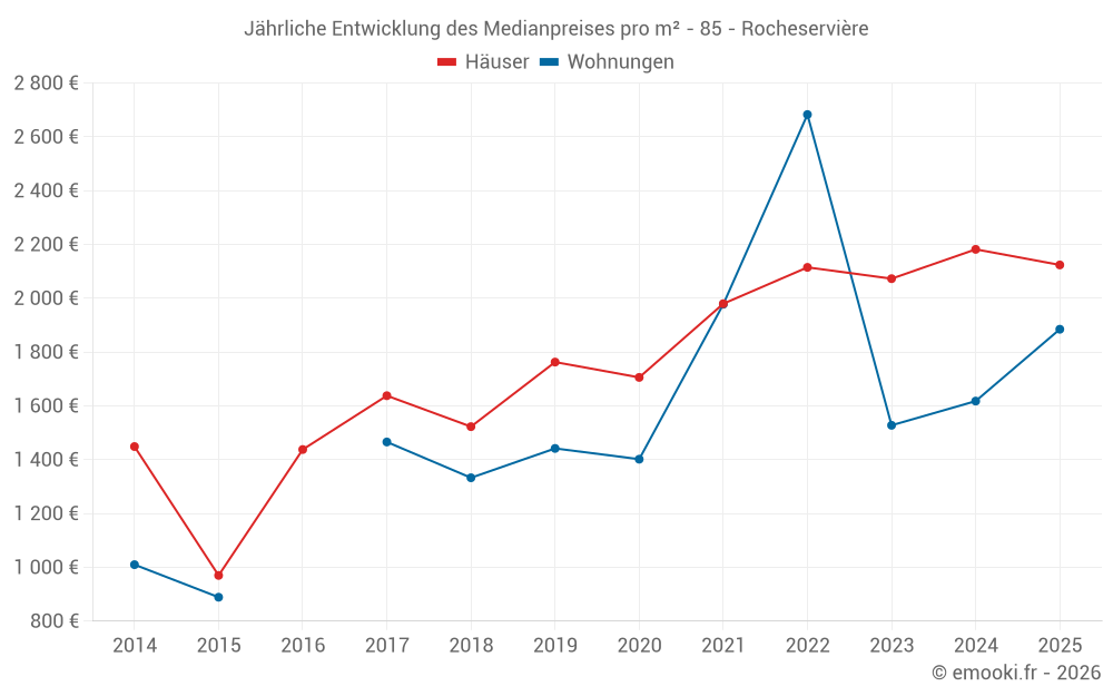 Der Durchschnittspreis auf den 37 Hausgeschäften der letzten 12 Monate in der Gemeinde Rocheservière betrug 2 182 € pro Quadratmeter für einen mittleren Immobilienwert von 199 000 €. Über diesen Zeitraum hinweg lagen 60% der Transaktionen zwischen 1 695 und 2 678 € pro Quadratmeter (vom 2. bis zum 8. Dezil).