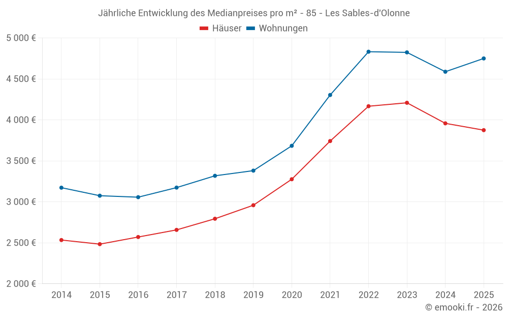 Der Durchschnittspreis auf den 91 Wohnungstransaktionen der letzten 3 Monate in der Gemeinde Les Sables-d'Olonne betrug 4 333 € pro Quadratmeter für einen mittleren Immobilienwert von 192 000 €. Über diesen Zeitraum hinweg lagen 60% der Transaktionen zwischen 3 127 und 5 888 € pro Quadratmeter (vom 2. bis zum 8. Dezil).
