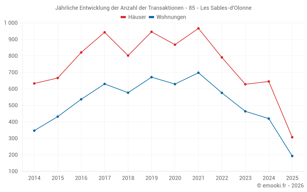 Der Durchschnittspreis auf den 148 Hausgeschäften der letzten 3 Monate in der Gemeinde Les Sables-d'Olonne betrug 3 721 € pro Quadratmeter für einen mittleren Immobilienwert von 315 000 €. Über diesen Zeitraum hinweg lagen 60% der Transaktionen zwischen 2 931 und 4 658 € pro Quadratmeter (vom 2. bis zum 8. Dezil).