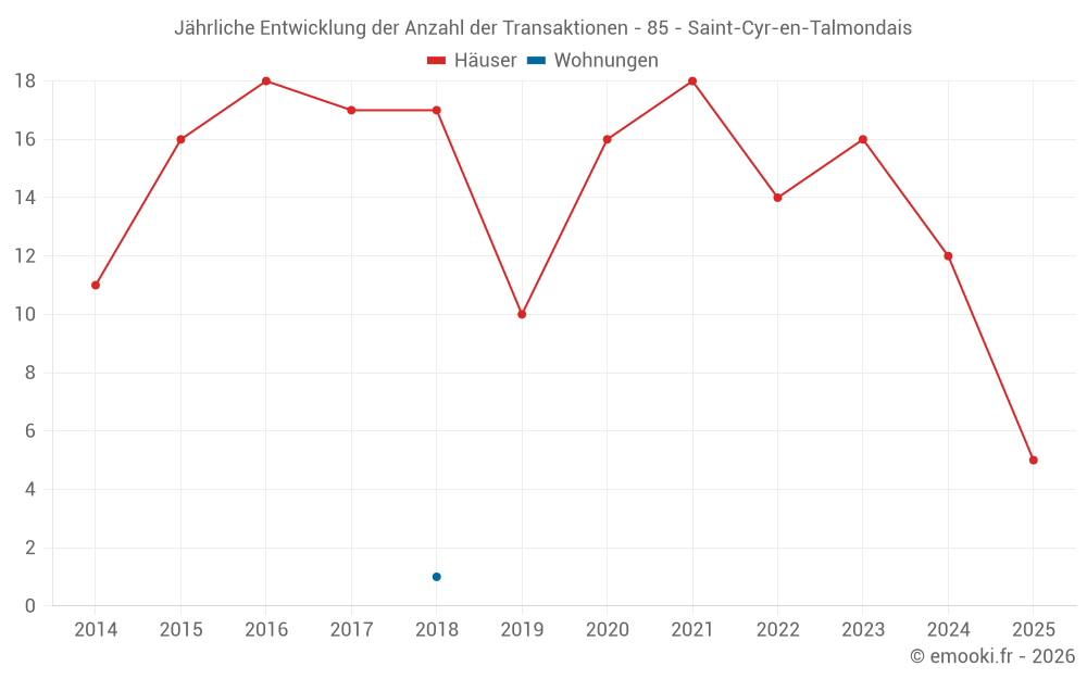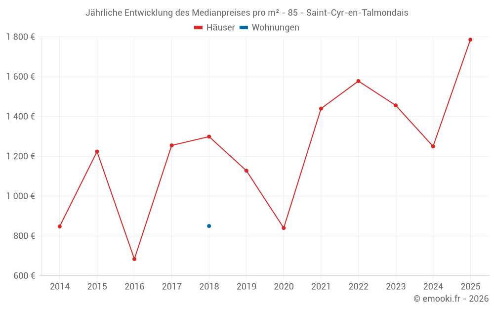 Der Durchschnittspreis auf den 26 Hausgeschäften der letzten 24 Monate in der Gemeinde Saint-Cyr-en-Talmondais betrug 1 797 € pro Quadratmeter für einen mittleren Immobilienwert von 124 000 €. Über diesen Zeitraum hinweg lagen 60% der Transaktionen zwischen 944 und 2 478 € pro Quadratmeter (vom 2. bis zum 8. Dezil).