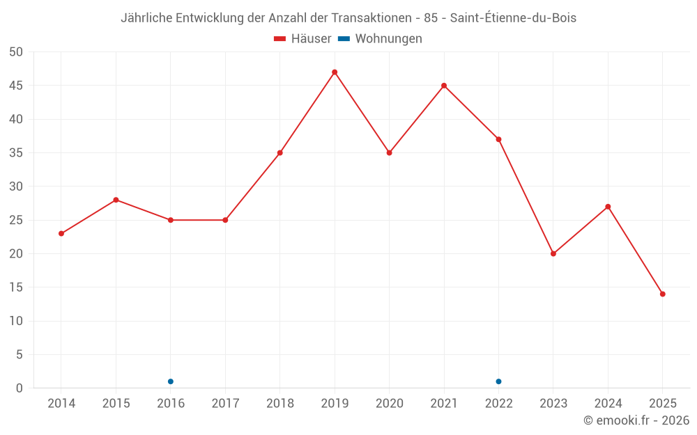 Der Durchschnittspreis auf den 31 Hausgeschäften der letzten 12 Monate in der Gemeinde Saint-Étienne-du-Bois betrug 2 124 € pro Quadratmeter für einen mittleren Immobilienwert von 197 500 €. Über diesen Zeitraum hinweg lagen 60% der Transaktionen zwischen 1 163 und 2 476 € pro Quadratmeter (vom 2. bis zum 8. Dezil).