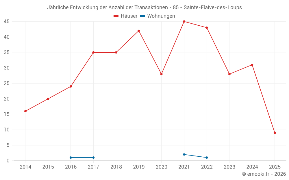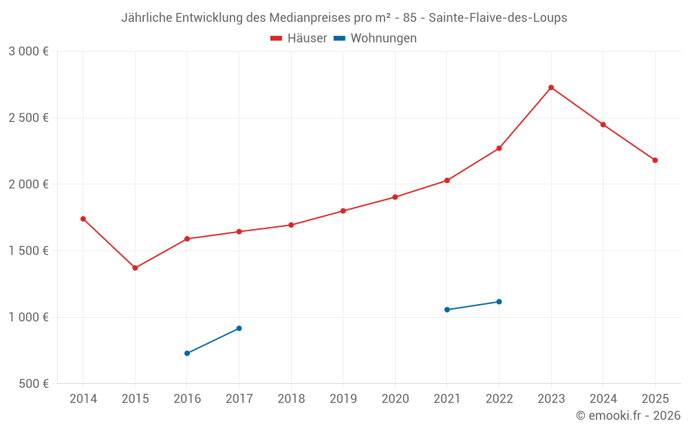 Der Durchschnittspreis auf den 24 Hausgeschäften der letzten 12 Monate in der Gemeinde Sainte-Flaive-des-Loups betrug 2 239 € pro Quadratmeter für einen mittleren Immobilienwert von 183 750 €. Über diesen Zeitraum hinweg lagen 60% der Transaktionen zwischen 1 502 und 2 624 € pro Quadratmeter (vom 2. bis zum 8. Dezil).