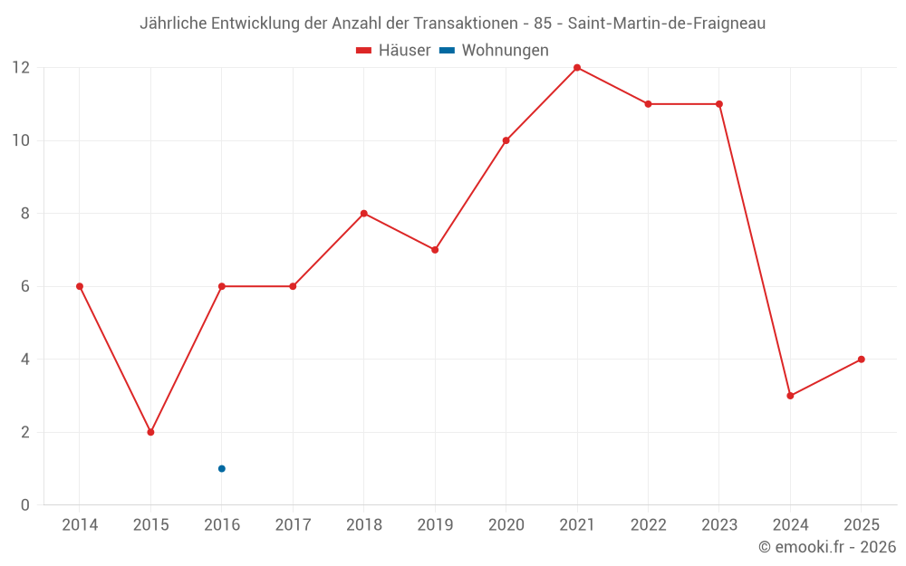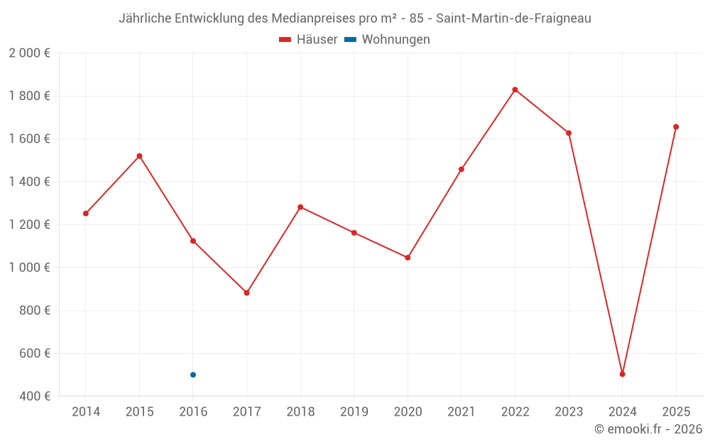Der Durchschnittspreis auf den 14 Hausgeschäften der letzten 24 Monate in der Gemeinde Saint-Martin-de-Fraigneau betrug 1 455 € pro Quadratmeter für einen mittleren Immobilienwert von 139 750 €. Über diesen Zeitraum hinweg lagen 60% der Transaktionen zwischen 1 030 und 1 752 € pro Quadratmeter (vom 2. bis zum 8. Dezil).