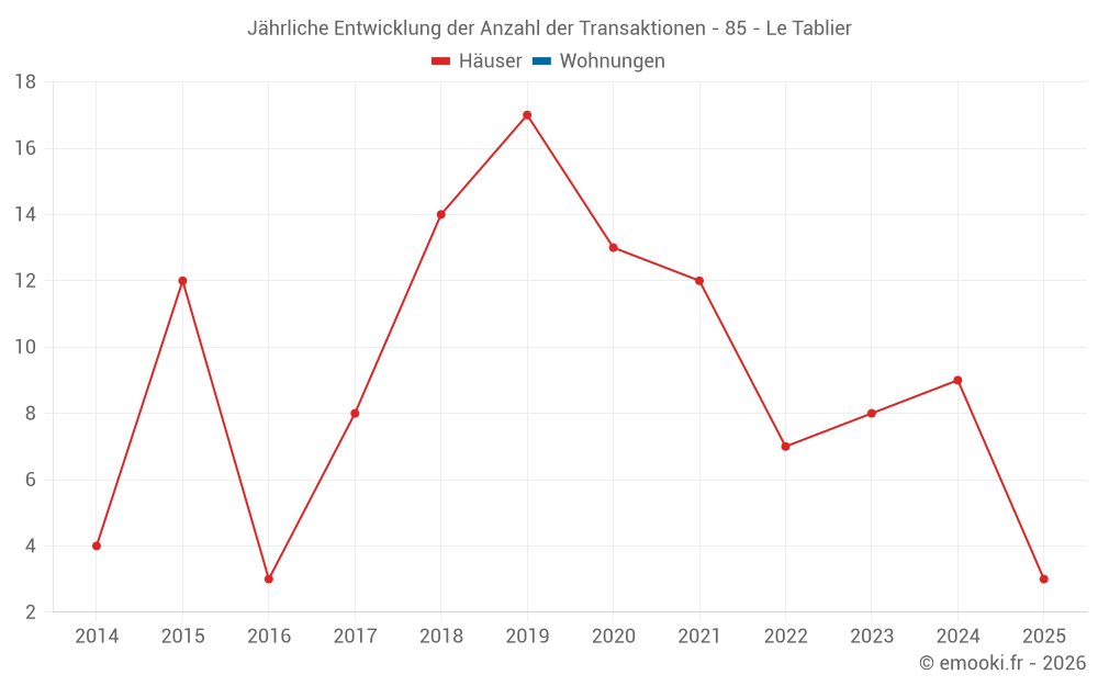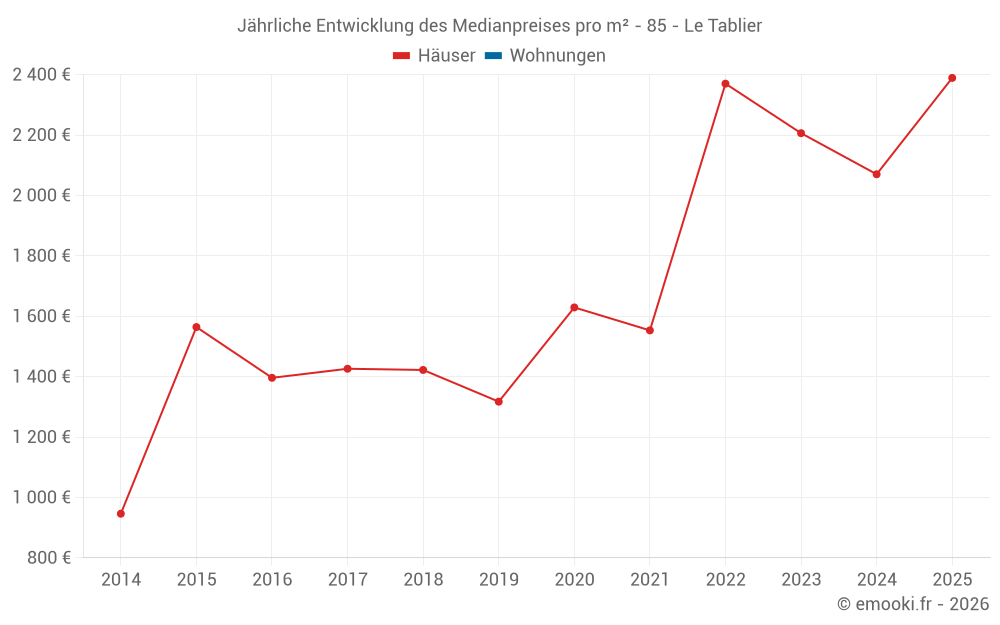 Der Durchschnittspreis auf den 16 Hausgeschäften der letzten 24 Monate in der Gemeinde Le Tablier betrug 2 162 € pro Quadratmeter für einen mittleren Immobilienwert von 214 000 €. Über diesen Zeitraum hinweg lagen 60% der Transaktionen zwischen 1 836 und 2 389 € pro Quadratmeter (vom 2. bis zum 8. Dezil).