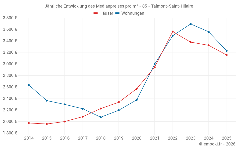 Der Durchschnittspreis auf den 45 Wohnungstransaktionen der letzten 12 Monate in der Gemeinde Talmont-Saint-Hilaire betrug 3 432 € pro Quadratmeter für einen mittleren Immobilienwert von 109 300 €. Über diesen Zeitraum hinweg lagen 60% der Transaktionen zwischen 3 088 und 4 014 € pro Quadratmeter (vom 2. bis zum 8. Dezil).