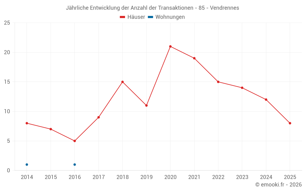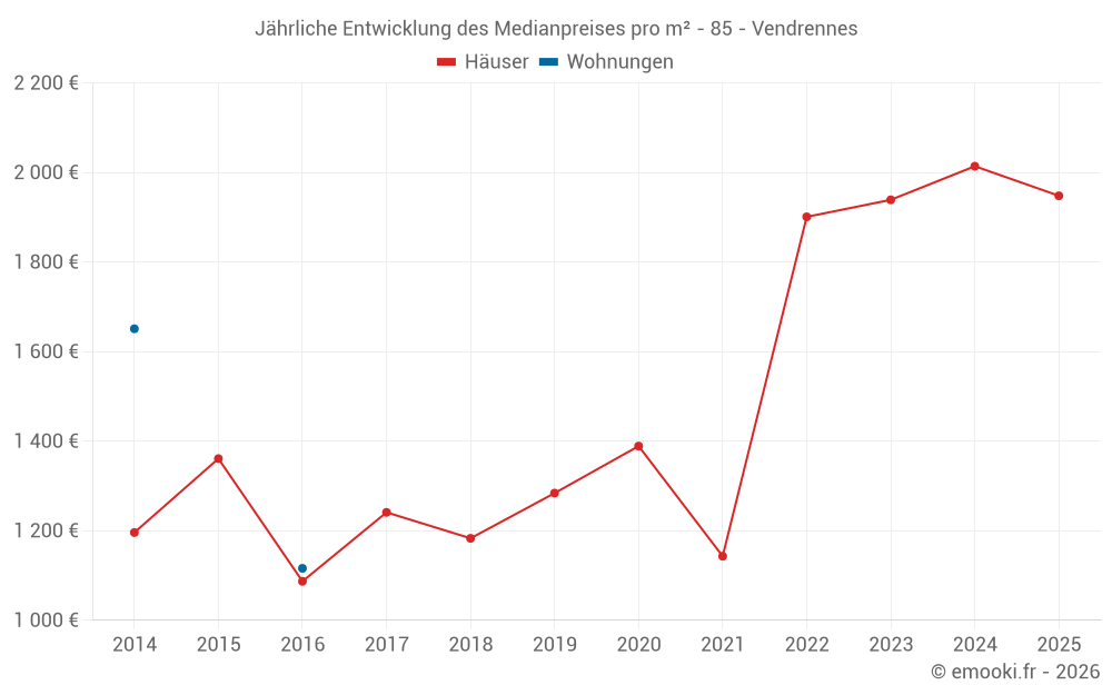 Der Durchschnittspreis auf den 28 Hausgeschäften der letzten 24 Monate in der Gemeinde Vendrennes betrug 2 008 € pro Quadratmeter für einen mittleren Immobilienwert von 160 625 €. Über diesen Zeitraum hinweg lagen 60% der Transaktionen zwischen 964 und 2 353 € pro Quadratmeter (vom 2. bis zum 8. Dezil).