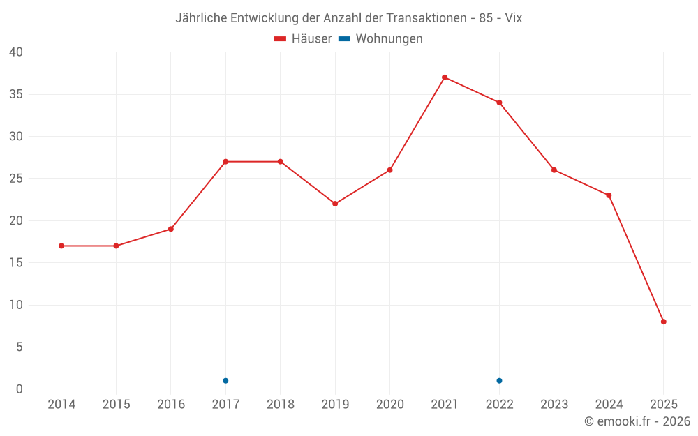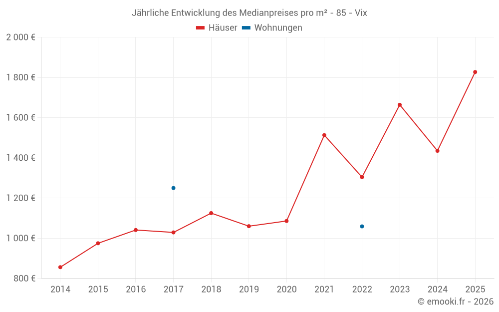 Der Durchschnittspreis auf den 22 Hausgeschäften der letzten 12 Monate in der Gemeinde Vix betrug 1 478 € pro Quadratmeter für einen mittleren Immobilienwert von 140 000 €. Über diesen Zeitraum hinweg lagen 60% der Transaktionen zwischen 808 und 1 945 € pro Quadratmeter (vom 2. bis zum 8. Dezil).