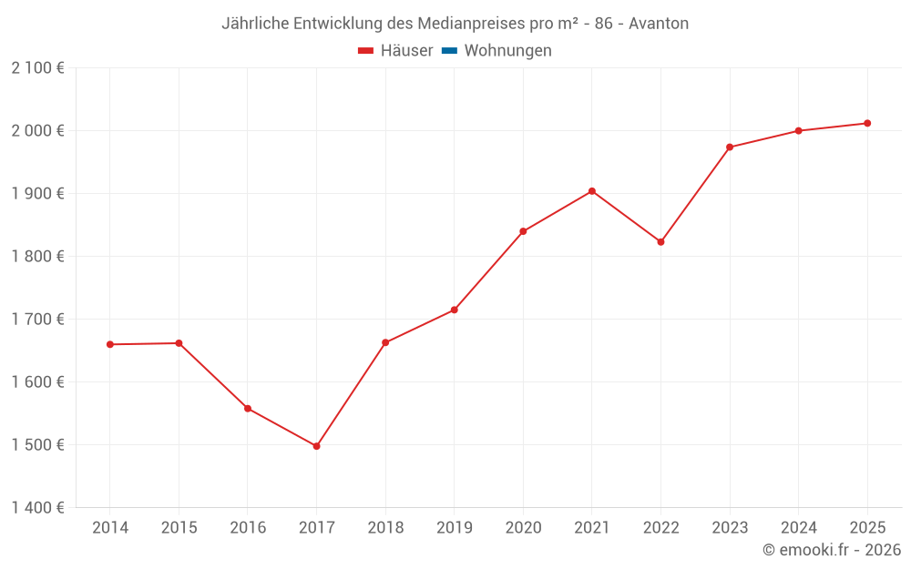 Der Durchschnittspreis auf den 20 Hausgeschäften der letzten 12 Monate in der Gemeinde Avanton betrug 2 120 € pro Quadratmeter für einen mittleren Immobilienwert von 202 450 €. Über diesen Zeitraum hinweg lagen 60% der Transaktionen zwischen 1 743 und 2 372 € pro Quadratmeter (vom 2. bis zum 8. Dezil).