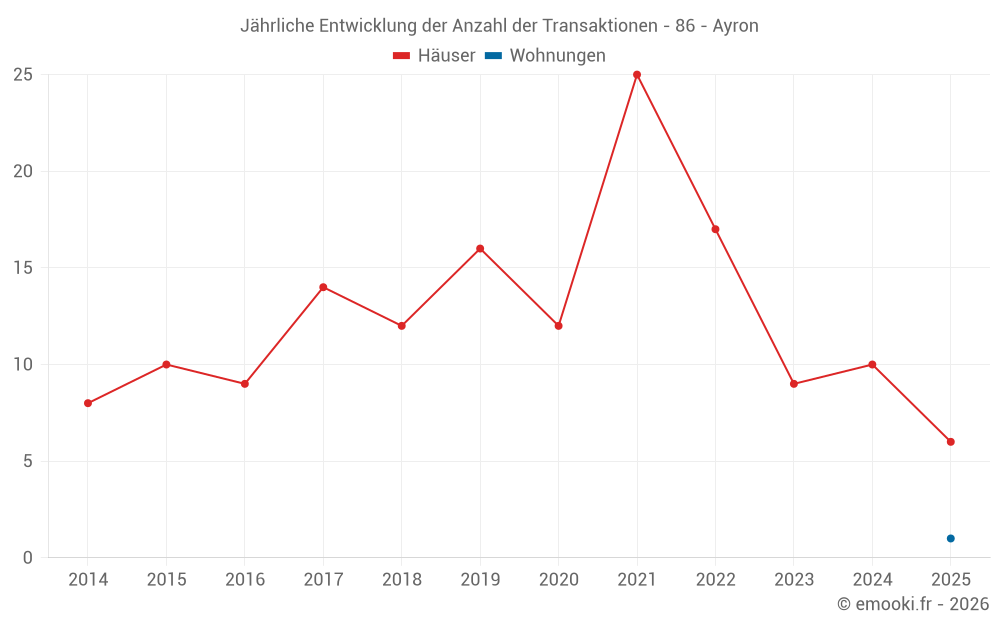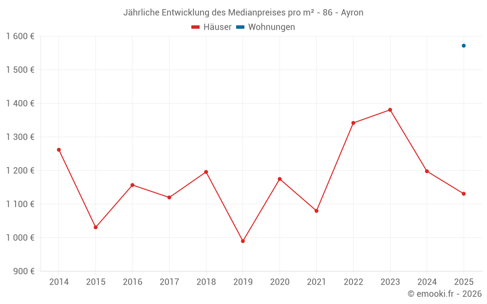 Der Durchschnittspreis auf den 22 Hausgeschäften der letzten 24 Monate in der Gemeinde Ayron betrug 1 268 € pro Quadratmeter für einen mittleren Immobilienwert von 125 500 €. Über diesen Zeitraum hinweg lagen 60% der Transaktionen zwischen 897 und 1 702 € pro Quadratmeter (vom 2. bis zum 8. Dezil).