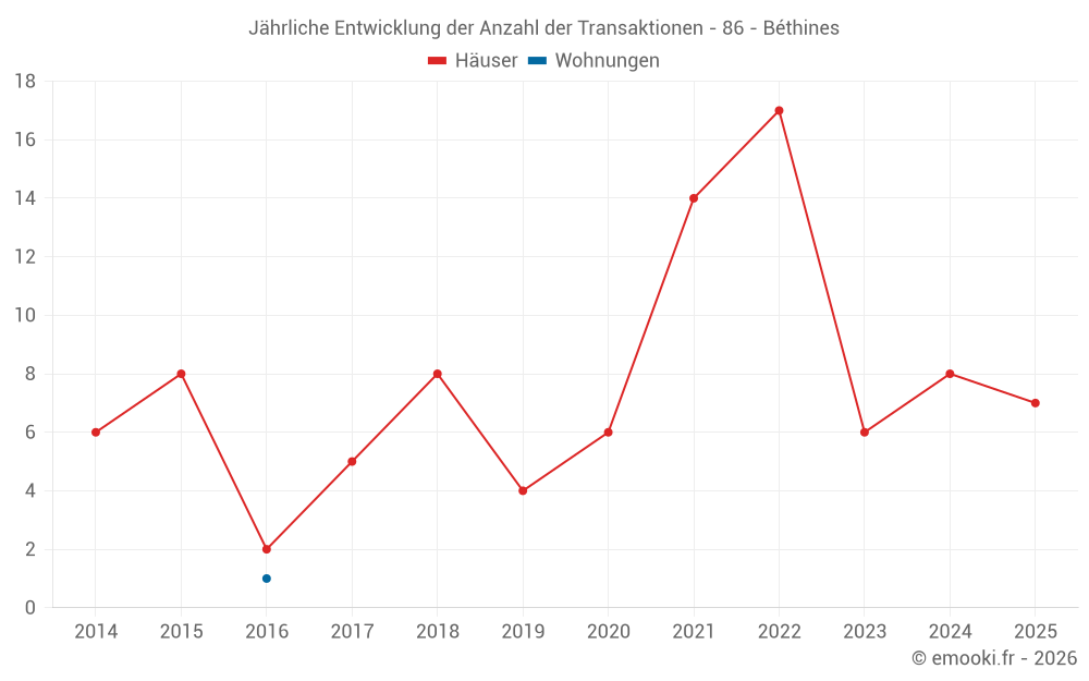 Der Durchschnittspreis auf den 17 Hausgeschäften der letzten 24 Monate in der Gemeinde Béthines betrug 558 € pro Quadratmeter für einen mittleren Immobilienwert von 50 000 €. Über diesen Zeitraum hinweg lagen 60% der Transaktionen zwischen 418 und 868 € pro Quadratmeter (vom 2. bis zum 8. Dezil).