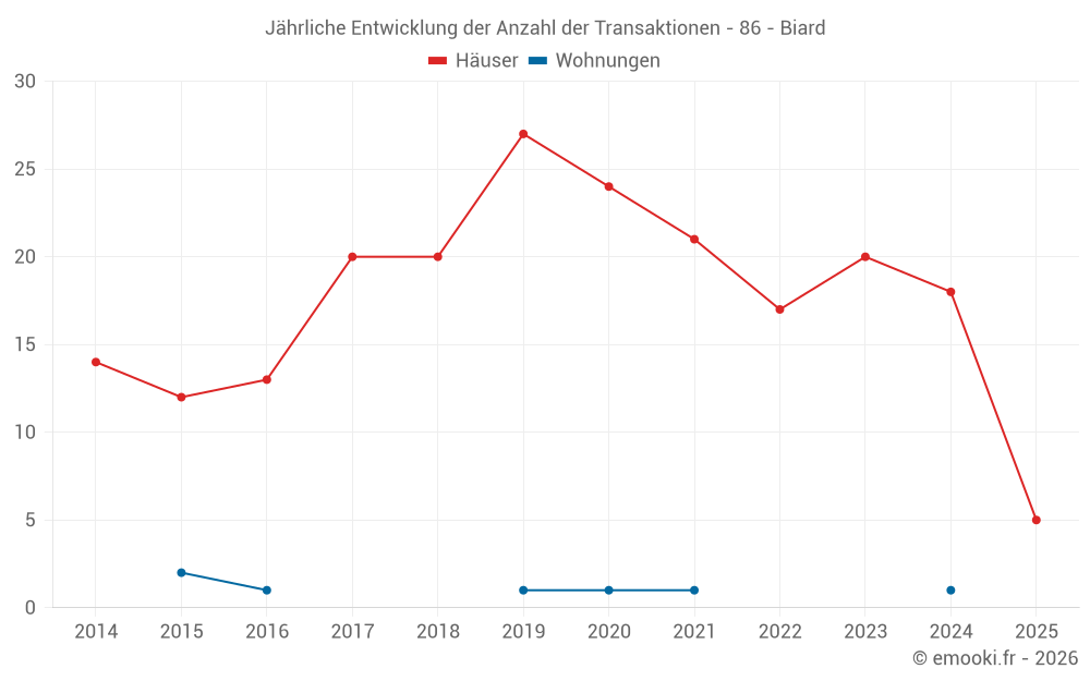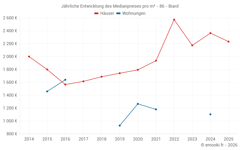Der Durchschnittspreis auf den 31 Hausgeschäften der letzten 24 Monate in der Gemeinde Biard betrug 2 287 € pro Quadratmeter für einen mittleren Immobilienwert von 188 000 €. Über diesen Zeitraum hinweg lagen 60% der Transaktionen zwischen 1 792 und 2 540 € pro Quadratmeter (vom 2. bis zum 8. Dezil).
