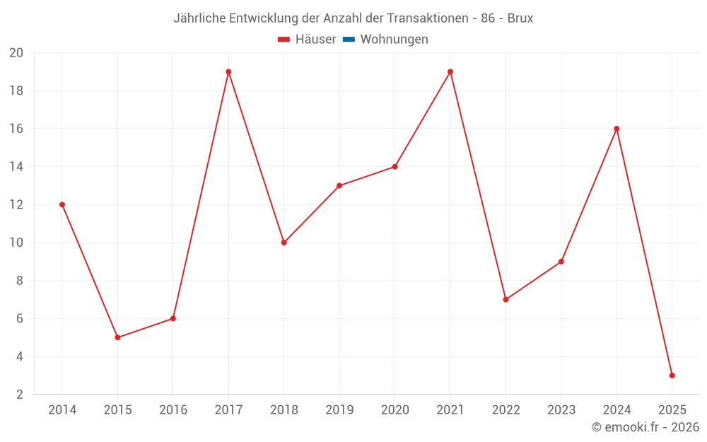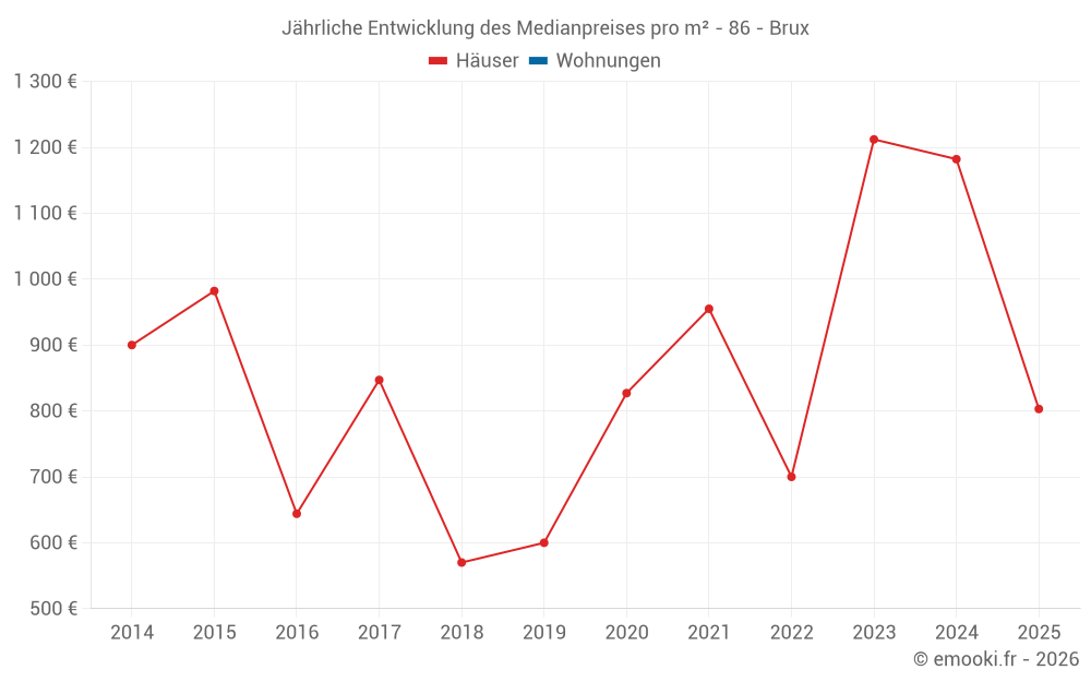Der Durchschnittspreis auf den 25 Hausgeschäften der letzten 24 Monate in der Gemeinde Brux betrug 1 141 € pro Quadratmeter für einen mittleren Immobilienwert von 105 000 €. Über diesen Zeitraum hinweg lagen 60% der Transaktionen zwischen 683 und 1 470 € pro Quadratmeter (vom 2. bis zum 8. Dezil).