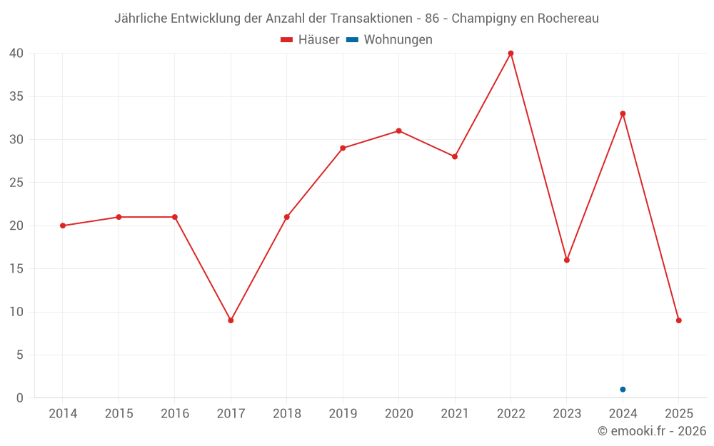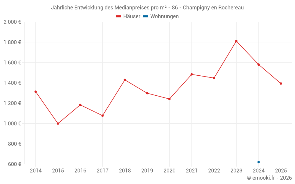 Der Durchschnittspreis auf den 29 Hausgeschäften der letzten 12 Monate in der Gemeinde Champigny en Rochereau betrug 1 443 € pro Quadratmeter für einen mittleren Immobilienwert von 145 000 €. Über diesen Zeitraum hinweg lagen 60% der Transaktionen zwischen 1 141 und 2 047 € pro Quadratmeter (vom 2. bis zum 8. Dezil).