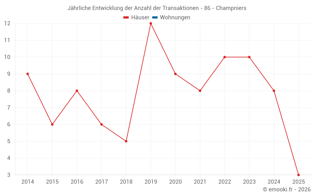 Der Durchschnittspreis auf den 18 Hausgeschäften der letzten 24 Monate in der Gemeinde Champniers betrug 869 € pro Quadratmeter für einen mittleren Immobilienwert von 94 000 €. Über diesen Zeitraum hinweg lagen 60% der Transaktionen zwischen 435 und 1 287 € pro Quadratmeter (vom 2. bis zum 8. Dezil).
