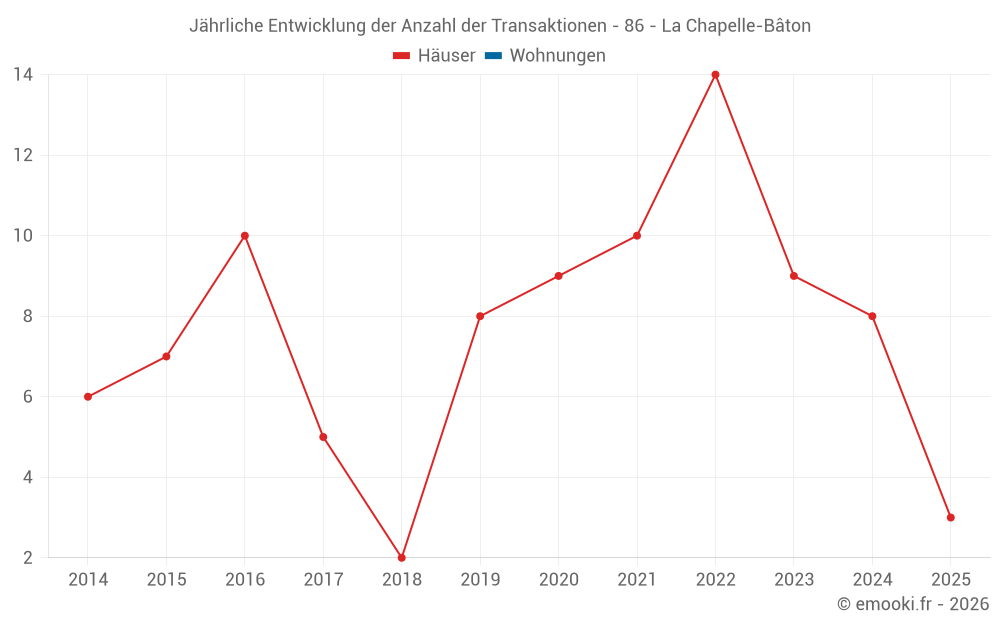 Der Durchschnittspreis auf den 17 Hausgeschäften der letzten 24 Monate in der Gemeinde La Chapelle-Bâton betrug 794 € pro Quadratmeter für einen mittleren Immobilienwert von 55 000 €. Über diesen Zeitraum hinweg lagen 60% der Transaktionen zwischen 440 und 1 280 € pro Quadratmeter (vom 2. bis zum 8. Dezil).
