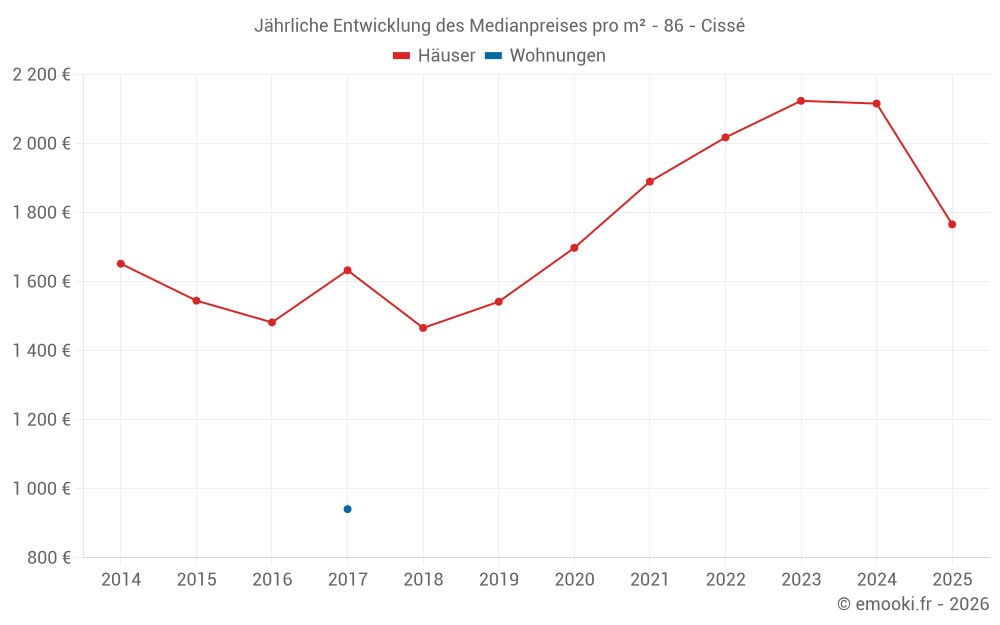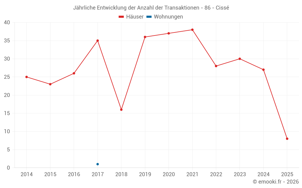 Der Durchschnittspreis auf den 29 Hausgeschäften der letzten 12 Monate in der Gemeinde Cissé betrug 1 875 € pro Quadratmeter für einen mittleren Immobilienwert von 200 000 €. Über diesen Zeitraum hinweg lagen 60% der Transaktionen zwischen 1 584 und 2 357 € pro Quadratmeter (vom 2. bis zum 8. Dezil).