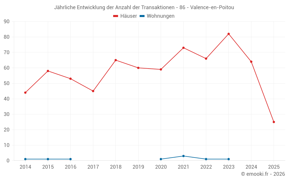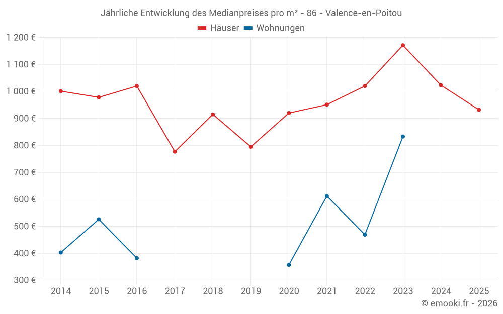 Der Durchschnittspreis auf den 25 Hausgeschäften der letzten 6 Monate in der Gemeinde Valence-en-Poitou betrug 932 € pro Quadratmeter für einen mittleren Immobilienwert von 88 000 €. Über diesen Zeitraum hinweg lagen 60% der Transaktionen zwischen 445 und 1 540 € pro Quadratmeter (vom 2. bis zum 8. Dezil).