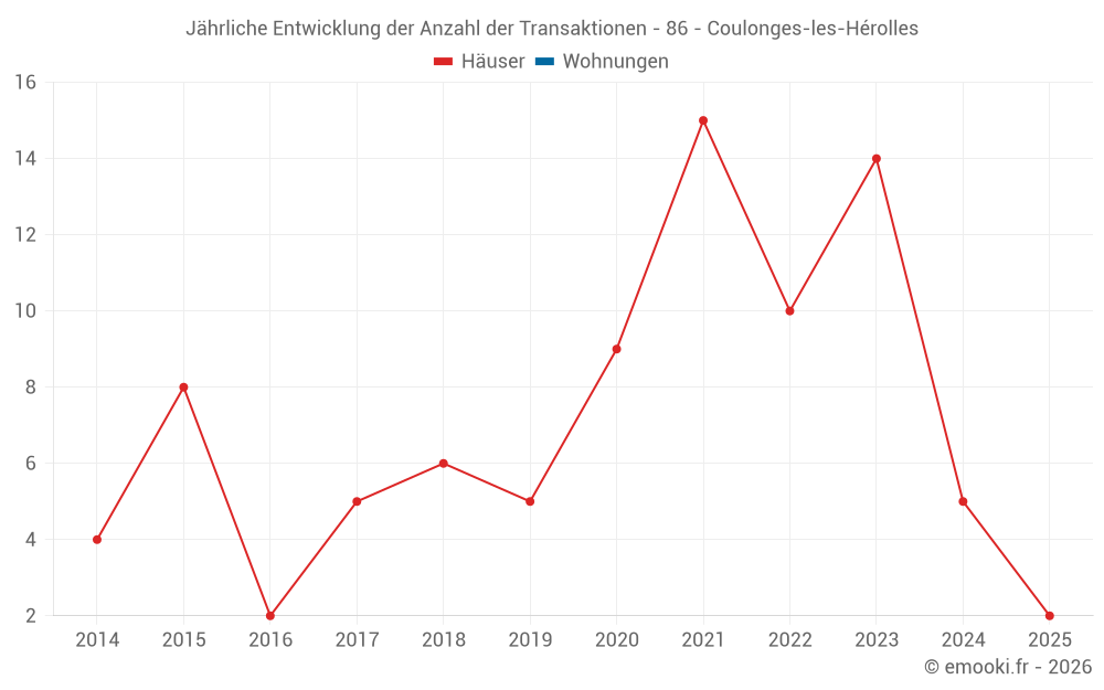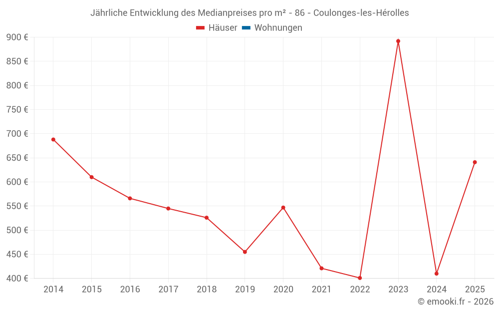 Der Durchschnittspreis auf den 16 Hausgeschäften der letzten 24 Monate in der Gemeinde Coulonges-les-Hérolles betrug 641 € pro Quadratmeter für einen mittleren Immobilienwert von 44 000 €. Über diesen Zeitraum hinweg lagen 60% der Transaktionen zwischen 425 und 887 € pro Quadratmeter (vom 2. bis zum 8. Dezil).
