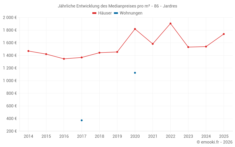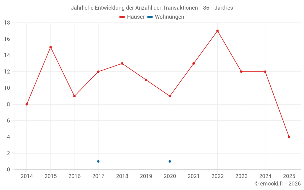 Der Durchschnittspreis auf den 22 Hausgeschäften der letzten 24 Monate in der Gemeinde Jardres betrug 1 570 € pro Quadratmeter für einen mittleren Immobilienwert von 184 750 €. Über diesen Zeitraum hinweg lagen 60% der Transaktionen zwischen 1 269 und 2 180 € pro Quadratmeter (vom 2. bis zum 8. Dezil).
