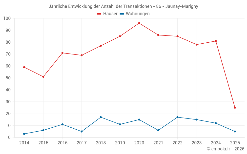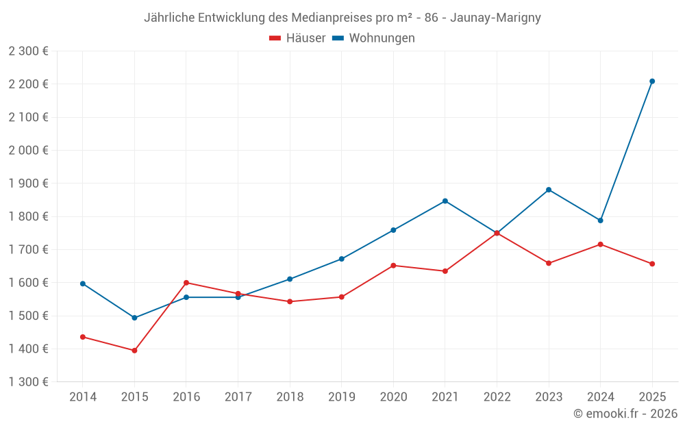 Der Durchschnittspreis auf den 25 Wohnungstransaktionen der letzten 24 Monate in der Gemeinde Jaunay-Marigny betrug 1 786 € pro Quadratmeter für einen mittleren Immobilienwert von 83 000 €. Über diesen Zeitraum hinweg lagen 60% der Transaktionen zwischen 1 448 und 2 922 € pro Quadratmeter (vom 2. bis zum 8. Dezil).
