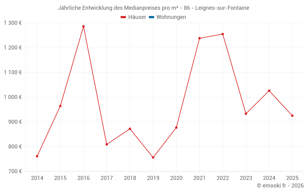 Der Durchschnittspreis auf den 14 Hausgeschäften der letzten 24 Monate in der Gemeinde Leignes-sur-Fontaine betrug 938 € pro Quadratmeter für einen mittleren Immobilienwert von 85 000 €. Über diesen Zeitraum hinweg lagen 60% der Transaktionen zwischen 866 und 1 143 € pro Quadratmeter (vom 2. bis zum 8. Dezil).