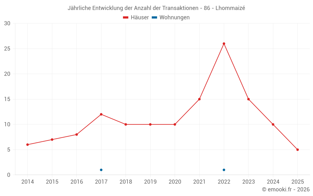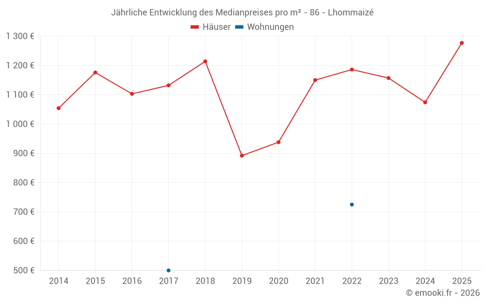 Der Durchschnittspreis auf den 23 Hausgeschäften der letzten 24 Monate in der Gemeinde Lhommaizé betrug 1 157 € pro Quadratmeter für einen mittleren Immobilienwert von 104 000 €. Über diesen Zeitraum hinweg lagen 60% der Transaktionen zwischen 751 und 1 363 € pro Quadratmeter (vom 2. bis zum 8. Dezil).