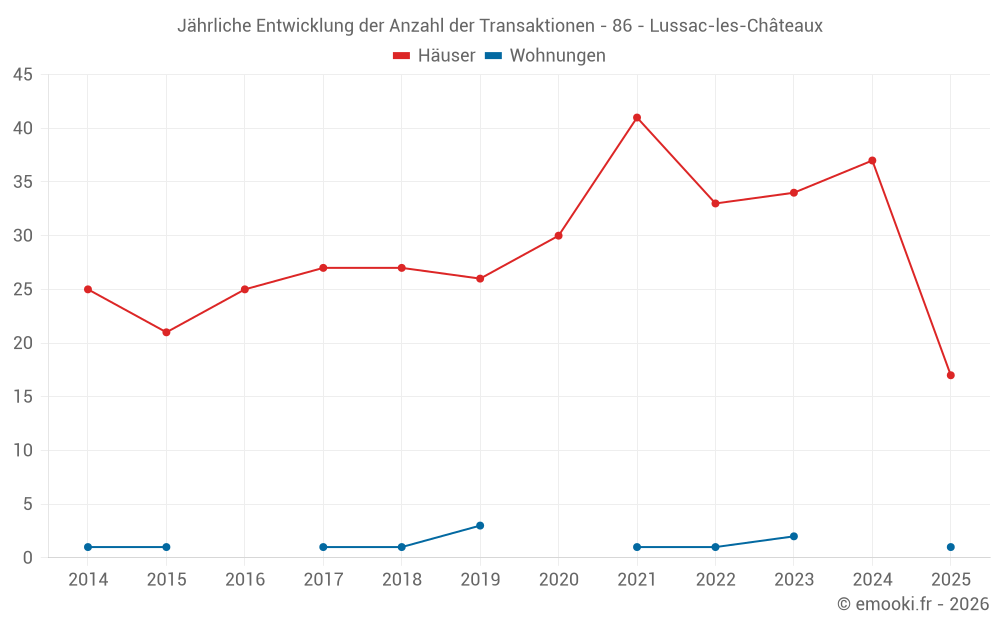 Der Durchschnittspreis auf den 39 Hausgeschäften der letzten 12 Monate in der Gemeinde Lussac-les-Châteaux betrug 1 189 € pro Quadratmeter für einen mittleren Immobilienwert von 100 000 €. Über diesen Zeitraum hinweg lagen 60% der Transaktionen zwischen 922 und 1 426 € pro Quadratmeter (vom 2. bis zum 8. Dezil).
