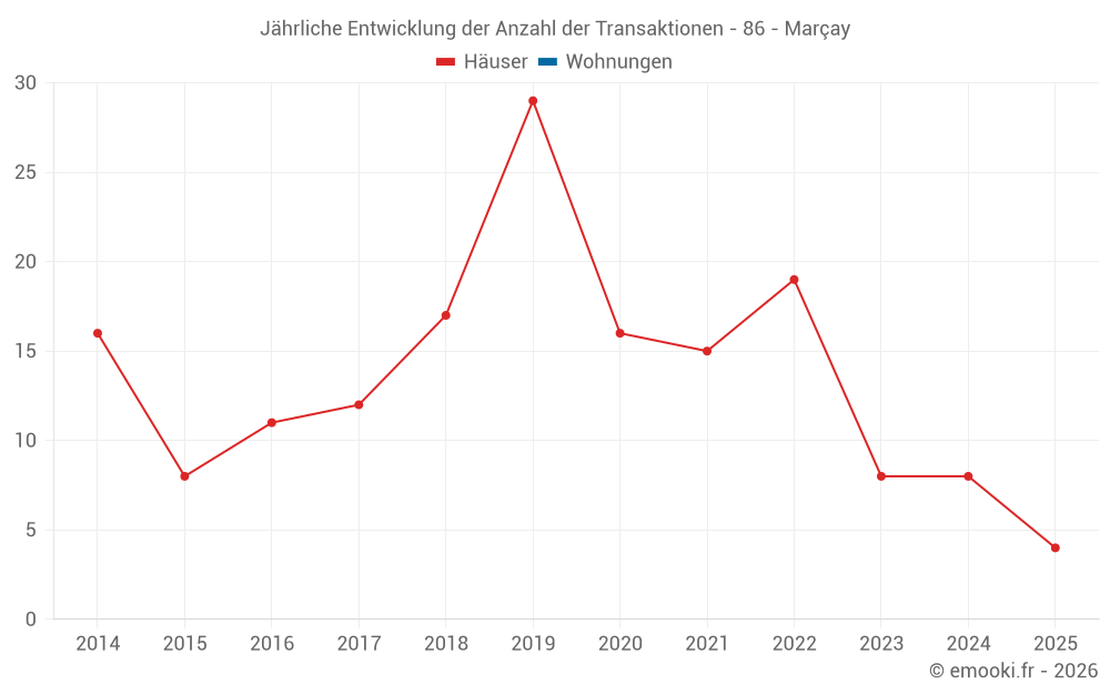 Der Durchschnittspreis auf den 16 Hausgeschäften der letzten 24 Monate in der Gemeinde Marçay betrug 1 580 € pro Quadratmeter für einen mittleren Immobilienwert von 164 218 €. Über diesen Zeitraum hinweg lagen 60% der Transaktionen zwischen 1 000 und 1 960 € pro Quadratmeter (vom 2. bis zum 8. Dezil).