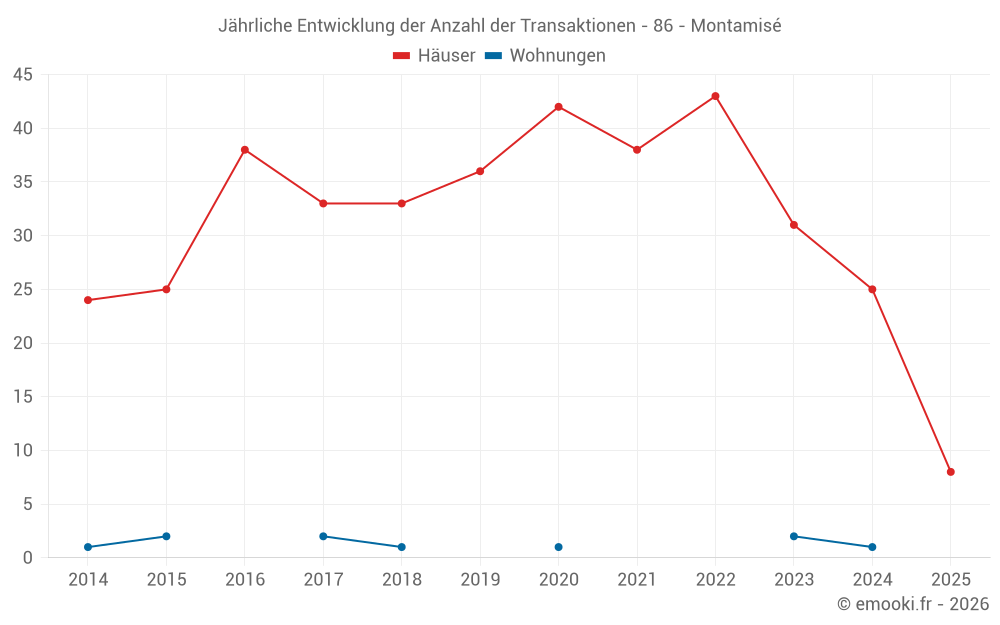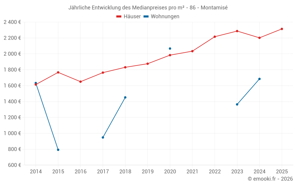 Der Durchschnittspreis auf den 21 Hausgeschäften der letzten 12 Monate in der Gemeinde Montamisé betrug 2 451 € pro Quadratmeter für einen mittleren Immobilienwert von 270 000 €. Über diesen Zeitraum hinweg lagen 60% der Transaktionen zwischen 1 975 und 2 833 € pro Quadratmeter (vom 2. bis zum 8. Dezil).