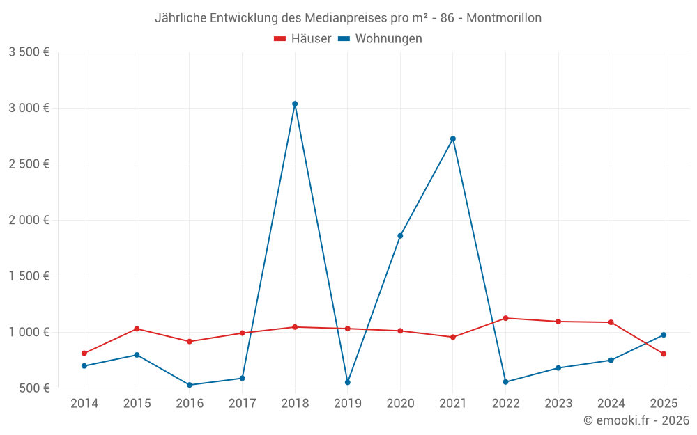 Der Durchschnittspreis auf den 16 Wohnungstransaktionen der letzten 24 Monate in der Gemeinde Montmorillon betrug 802 € pro Quadratmeter für einen mittleren Immobilienwert von 42 000 €. Über diesen Zeitraum hinweg lagen 60% der Transaktionen zwischen 591 und 1 100 € pro Quadratmeter (vom 2. bis zum 8. Dezil).