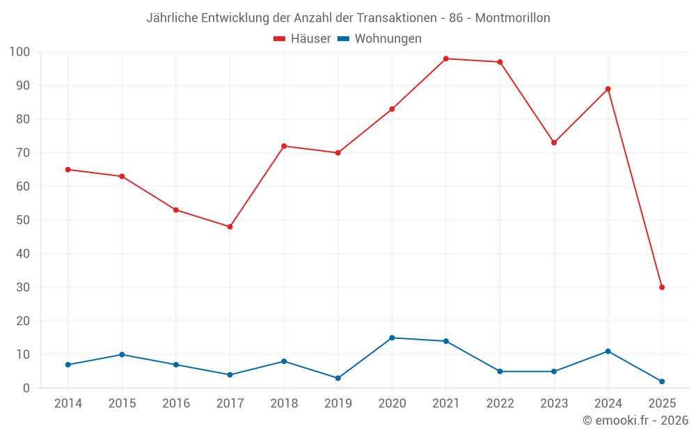 Der Durchschnittspreis auf den 30 Hausgeschäften der letzten 6 Monate in der Gemeinde Montmorillon betrug 806 € pro Quadratmeter für einen mittleren Immobilienwert von 67 500 €. Über diesen Zeitraum hinweg lagen 60% der Transaktionen zwischen 493 und 1 237 € pro Quadratmeter (vom 2. bis zum 8. Dezil).