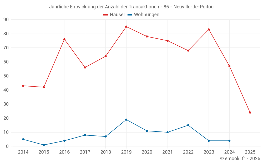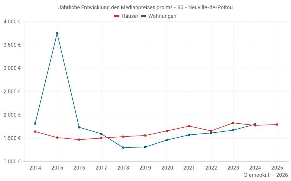 Der Durchschnittspreis auf den 24 Hausgeschäften der letzten 6 Monate in der Gemeinde Neuville-de-Poitou betrug 1 794 € pro Quadratmeter für einen mittleren Immobilienwert von 192 142 €. Über diesen Zeitraum hinweg lagen 60% der Transaktionen zwischen 1 313 und 2 221 € pro Quadratmeter (vom 2. bis zum 8. Dezil).