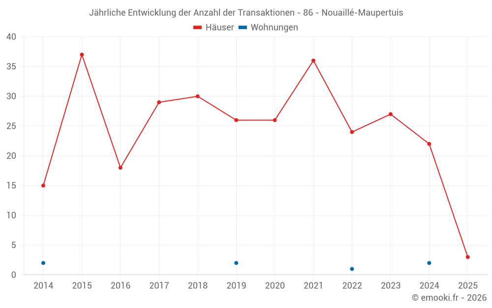 Der Durchschnittspreis auf den 18 Hausgeschäften der letzten 12 Monate in der Gemeinde Nouaillé-Maupertuis betrug 2 036 € pro Quadratmeter für einen mittleren Immobilienwert von 230 250 €. Über diesen Zeitraum hinweg lagen 60% der Transaktionen zwischen 1 799 und 2 427 € pro Quadratmeter (vom 2. bis zum 8. Dezil).