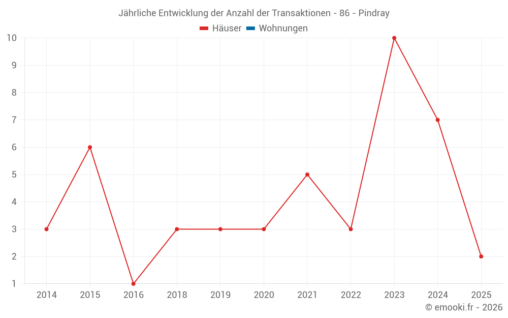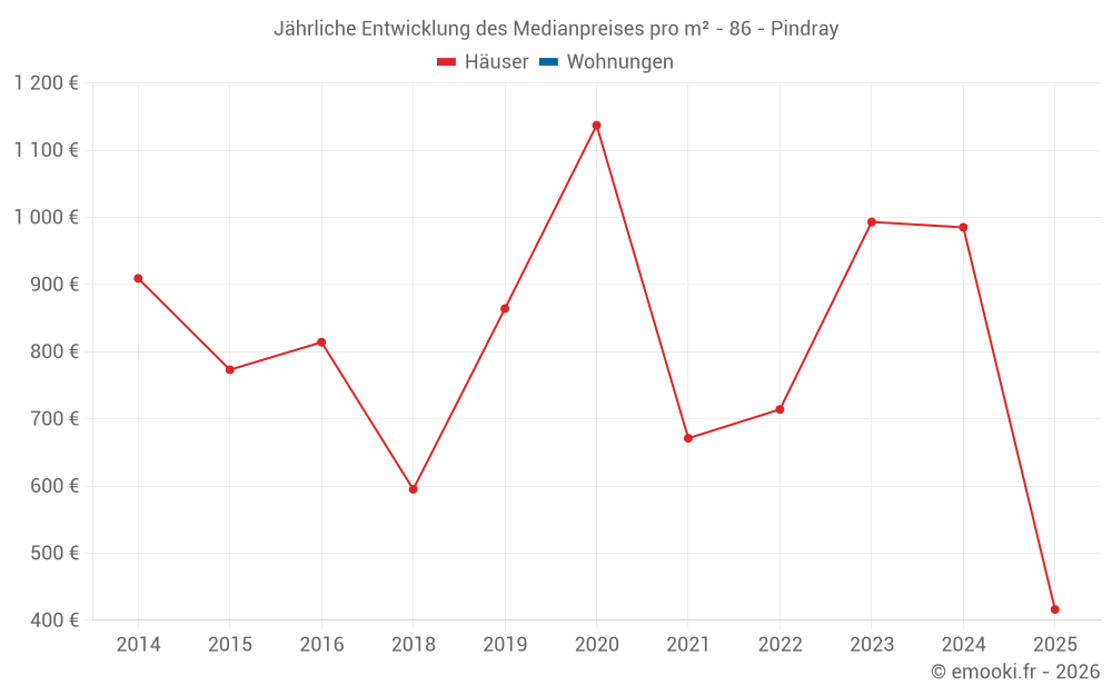 Der Durchschnittspreis auf den 15 Hausgeschäften der letzten 24 Monate in der Gemeinde Pindray betrug 953 € pro Quadratmeter für einen mittleren Immobilienwert von 89 420 €. Über diesen Zeitraum hinweg lagen 60% der Transaktionen zwischen 694 und 1 082 € pro Quadratmeter (vom 2. bis zum 8. Dezil).