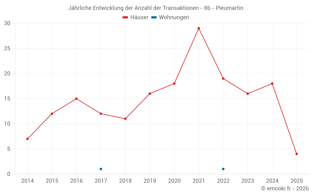 Der Durchschnittspreis auf den 16 Hausgeschäften der letzten 12 Monate in der Gemeinde Pleumartin betrug 908 € pro Quadratmeter für einen mittleren Immobilienwert von 93 500 €. Über diesen Zeitraum hinweg lagen 60% der Transaktionen zwischen 813 und 1 194 € pro Quadratmeter (vom 2. bis zum 8. Dezil).