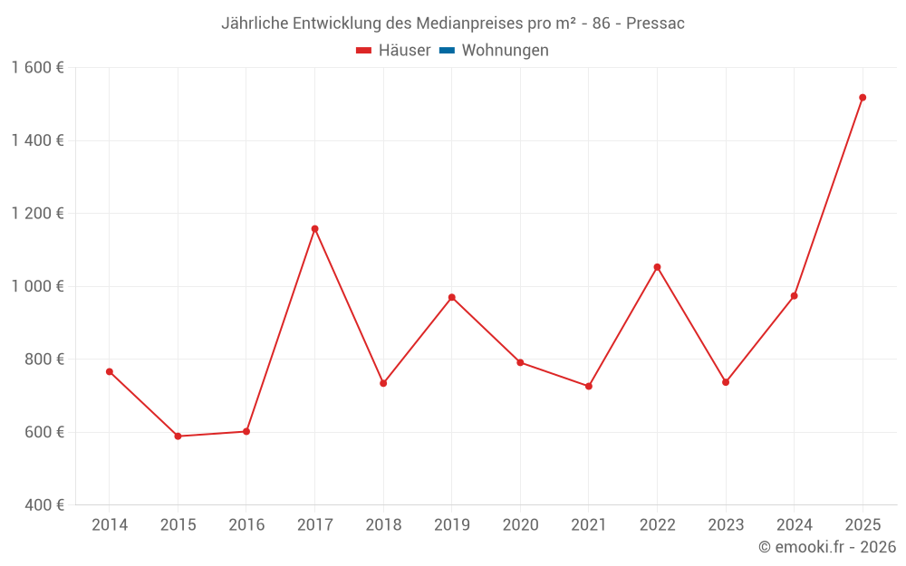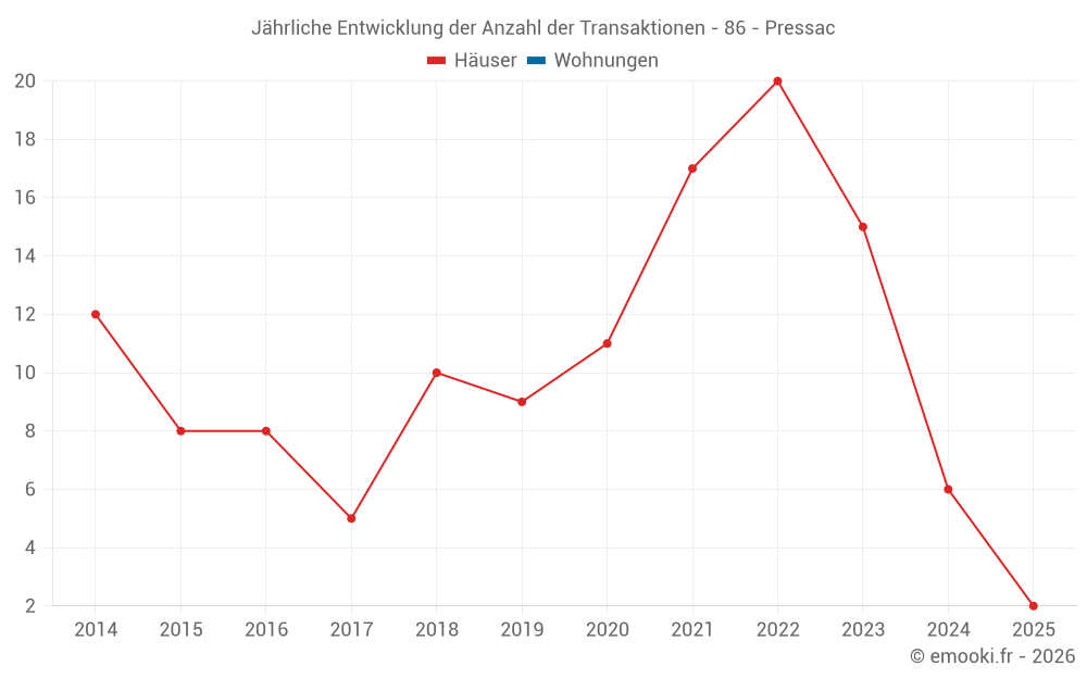 Der Durchschnittspreis auf den 16 Hausgeschäften der letzten 24 Monate in der Gemeinde Pressac betrug 874 € pro Quadratmeter für einen mittleren Immobilienwert von 80 750 €. Über diesen Zeitraum hinweg lagen 60% der Transaktionen zwischen 584 und 1 649 € pro Quadratmeter (vom 2. bis zum 8. Dezil).