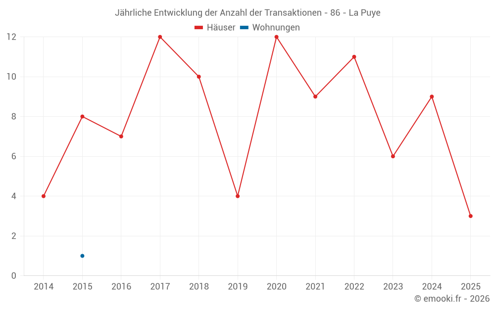 Der Durchschnittspreis auf den 15 Hausgeschäften der letzten 24 Monate in der Gemeinde La Puye betrug 736 € pro Quadratmeter für einen mittleren Immobilienwert von 74 000 €. Über diesen Zeitraum hinweg lagen 60% der Transaktionen zwischen 472 und 1 187 € pro Quadratmeter (vom 2. bis zum 8. Dezil).