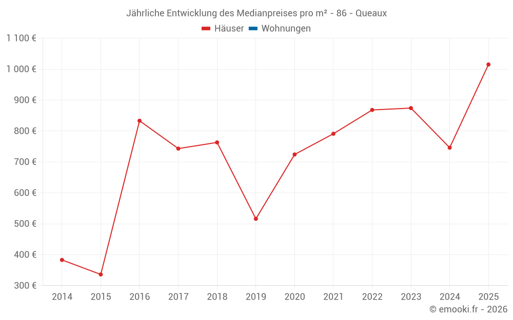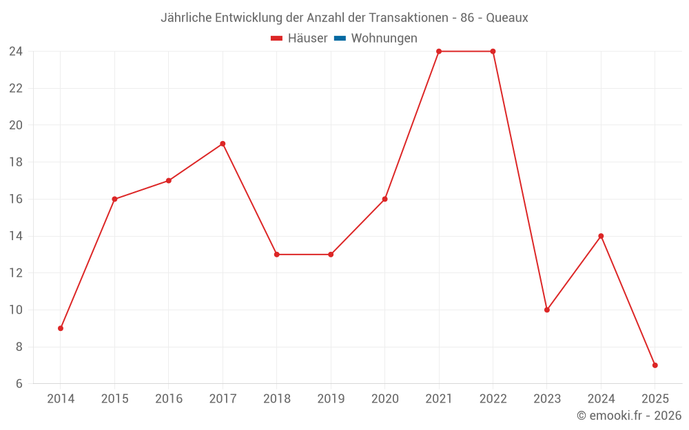 Der Durchschnittspreis auf den 16 Hausgeschäften der letzten 12 Monate in der Gemeinde Queaux betrug 983 € pro Quadratmeter für einen mittleren Immobilienwert von 88 734 €. Über diesen Zeitraum hinweg lagen 60% der Transaktionen zwischen 719 und 1 129 € pro Quadratmeter (vom 2. bis zum 8. Dezil).