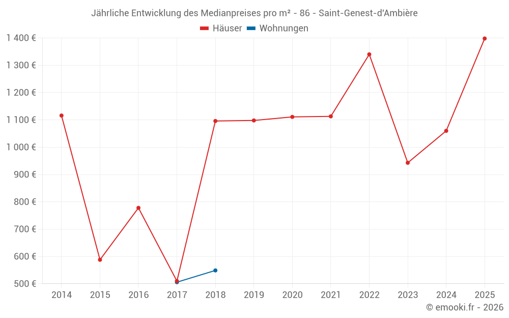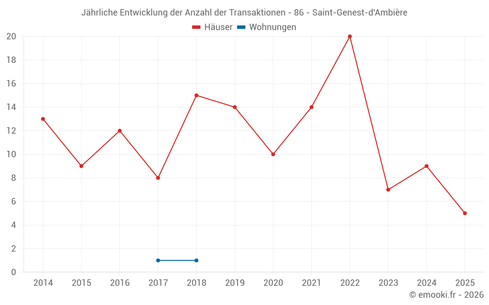 Der Durchschnittspreis auf den 18 Hausgeschäften der letzten 24 Monate in der Gemeinde Saint-Genest-d'Ambière betrug 1 234 € pro Quadratmeter für einen mittleren Immobilienwert von 133 920 €. Über diesen Zeitraum hinweg lagen 60% der Transaktionen zwischen 897 und 1 472 € pro Quadratmeter (vom 2. bis zum 8. Dezil).