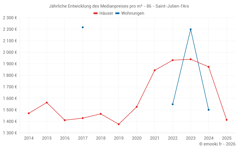 Der Durchschnittspreis auf den 23 Hausgeschäften der letzten 12 Monate in der Gemeinde Saint-Julien-l'Ars betrug 1 845 € pro Quadratmeter für einen mittleren Immobilienwert von 215 000 €. Über diesen Zeitraum hinweg lagen 60% der Transaktionen zwischen 1 391 und 2 278 € pro Quadratmeter (vom 2. bis zum 8. Dezil).