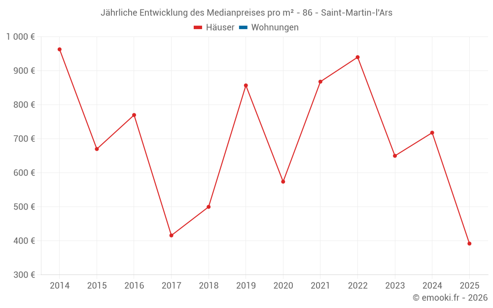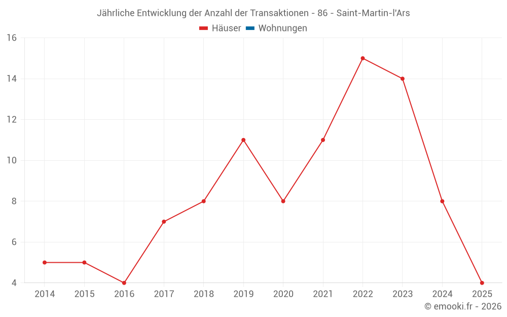 Der Durchschnittspreis auf den 23 Hausgeschäften der letzten 24 Monate in der Gemeinde Saint-Martin-l'Ars betrug 571 € pro Quadratmeter für einen mittleren Immobilienwert von 60 000 €. Über diesen Zeitraum hinweg lagen 60% der Transaktionen zwischen 315 und 937 € pro Quadratmeter (vom 2. bis zum 8. Dezil).