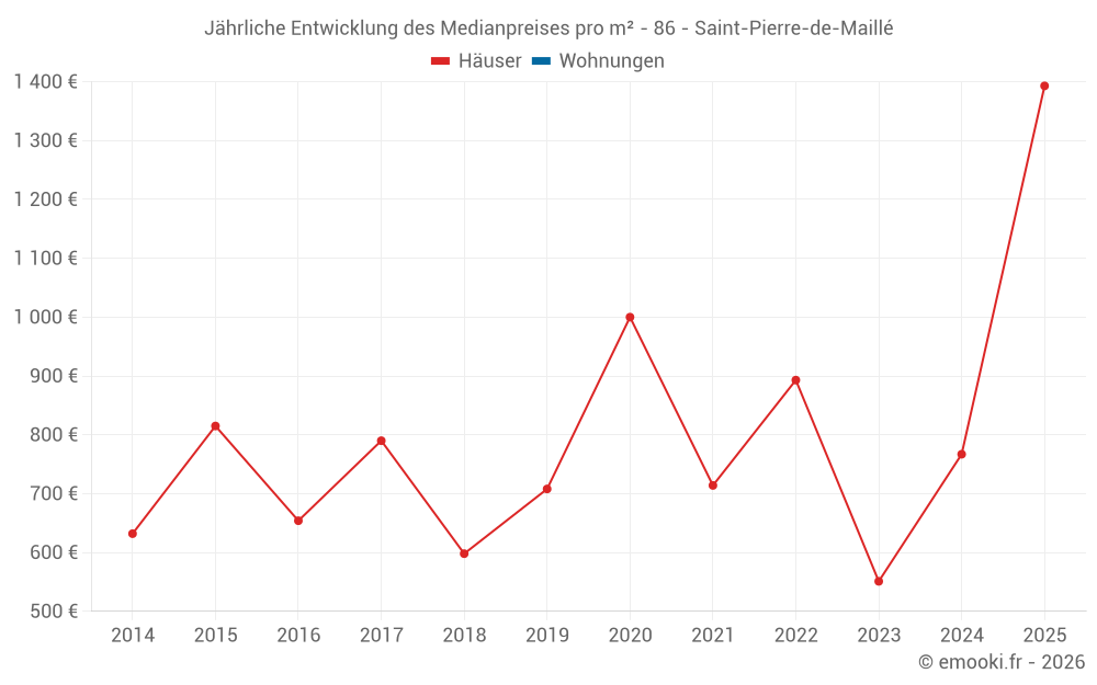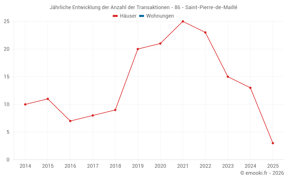 Der Durchschnittspreis auf den 24 Hausgeschäften der letzten 24 Monate in der Gemeinde Saint-Pierre-de-Maillé betrug 704 € pro Quadratmeter für einen mittleren Immobilienwert von 40 000 €. Über diesen Zeitraum hinweg lagen 60% der Transaktionen zwischen 316 und 1 226 € pro Quadratmeter (vom 2. bis zum 8. Dezil).