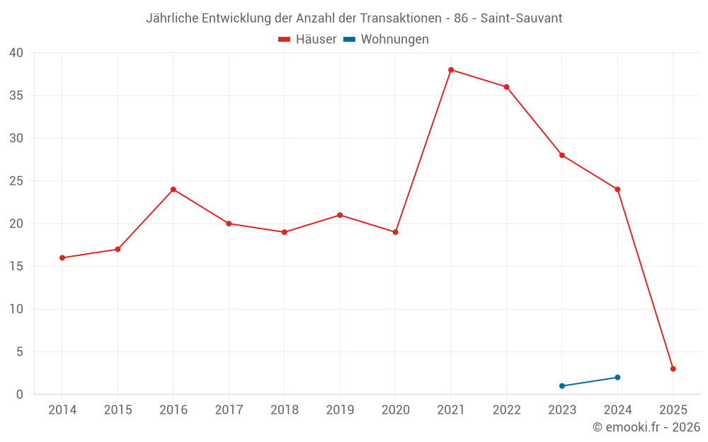 Der Durchschnittspreis auf den 17 Hausgeschäften der letzten 12 Monate in der Gemeinde Saint-Sauvant betrug 911 € pro Quadratmeter für einen mittleren Immobilienwert von 80 000 €. Über diesen Zeitraum hinweg lagen 60% der Transaktionen zwischen 523 und 1 289 € pro Quadratmeter (vom 2. bis zum 8. Dezil).