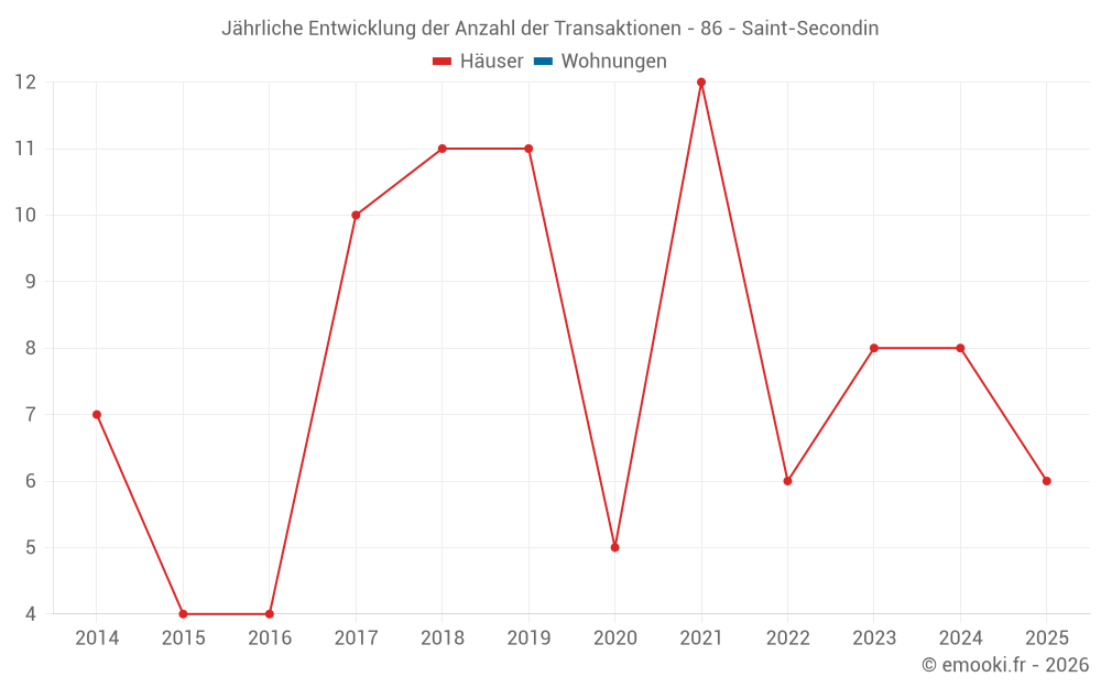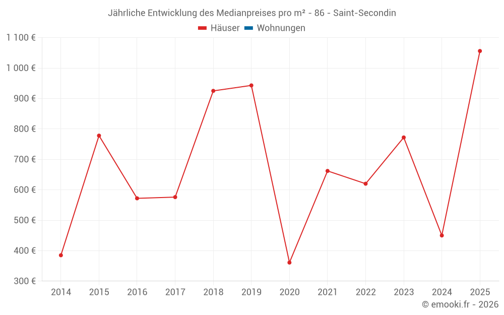 Der Durchschnittspreis auf den 17 Hausgeschäften der letzten 24 Monate in der Gemeinde Saint-Secondin betrug 500 € pro Quadratmeter für einen mittleren Immobilienwert von 45 000 €. Über diesen Zeitraum hinweg lagen 60% der Transaktionen zwischen 207 und 1 136 € pro Quadratmeter (vom 2. bis zum 8. Dezil).