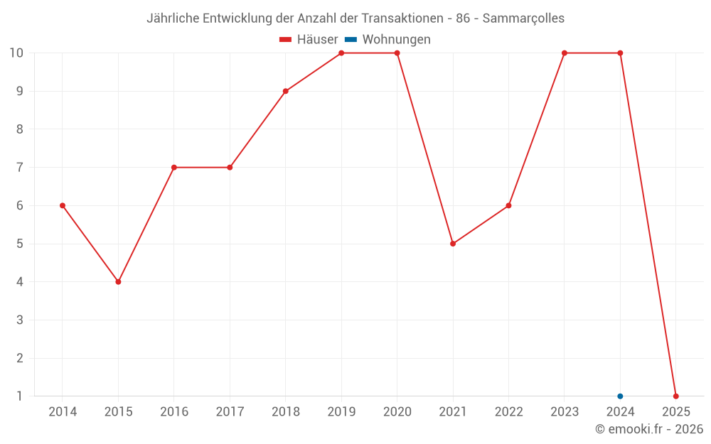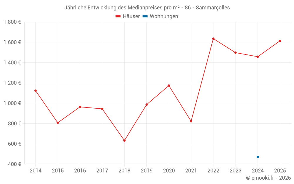 Der Durchschnittspreis auf den 17 Hausgeschäften der letzten 24 Monate in der Gemeinde Sammarçolles betrug 1 452 € pro Quadratmeter für einen mittleren Immobilienwert von 138 000 €. Über diesen Zeitraum hinweg lagen 60% der Transaktionen zwischen 737 und 1 778 € pro Quadratmeter (vom 2. bis zum 8. Dezil).