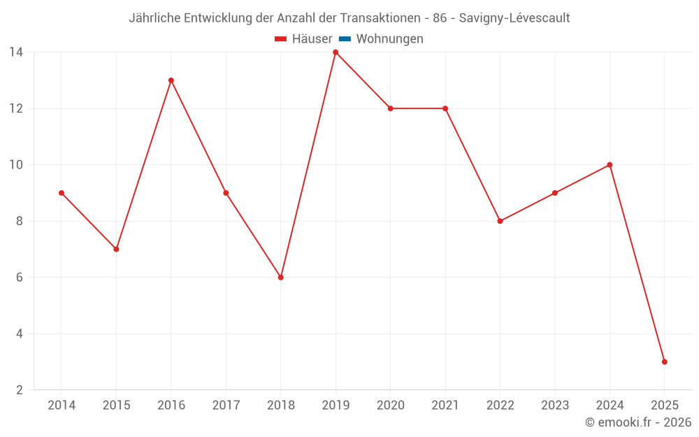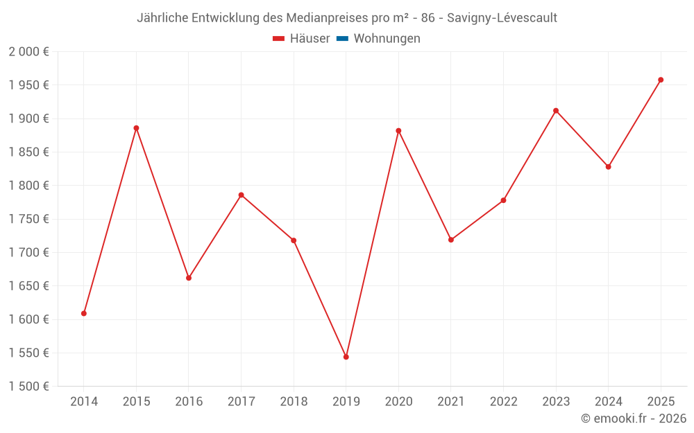 Der Durchschnittspreis auf den 18 Hausgeschäften der letzten 24 Monate in der Gemeinde Savigny-Lévescault betrug 1 910 € pro Quadratmeter für einen mittleren Immobilienwert von 249 186 €. Über diesen Zeitraum hinweg lagen 60% der Transaktionen zwischen 1 596 und 2 089 € pro Quadratmeter (vom 2. bis zum 8. Dezil).