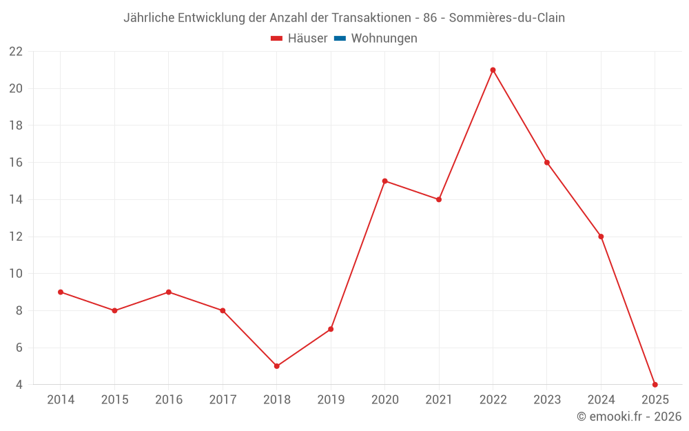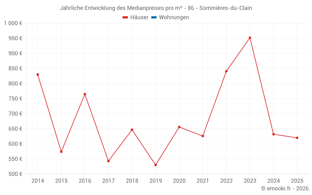 Der Durchschnittspreis auf den 25 Hausgeschäften der letzten 24 Monate in der Gemeinde Sommières-du-Clain betrug 681 € pro Quadratmeter für einen mittleren Immobilienwert von 61 000 €. Über diesen Zeitraum hinweg lagen 60% der Transaktionen zwischen 444 und 1 021 € pro Quadratmeter (vom 2. bis zum 8. Dezil).