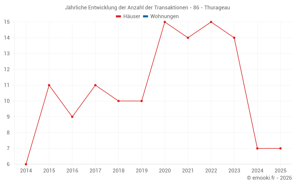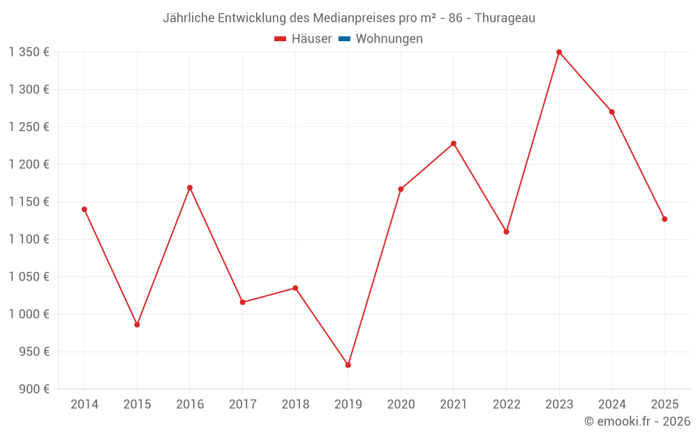 Der Durchschnittspreis auf den 18 Hausgeschäften der letzten 24 Monate in der Gemeinde Thurageau betrug 1 269 € pro Quadratmeter für einen mittleren Immobilienwert von 105 000 €. Über diesen Zeitraum hinweg lagen 60% der Transaktionen zwischen 759 und 1 563 € pro Quadratmeter (vom 2. bis zum 8. Dezil).